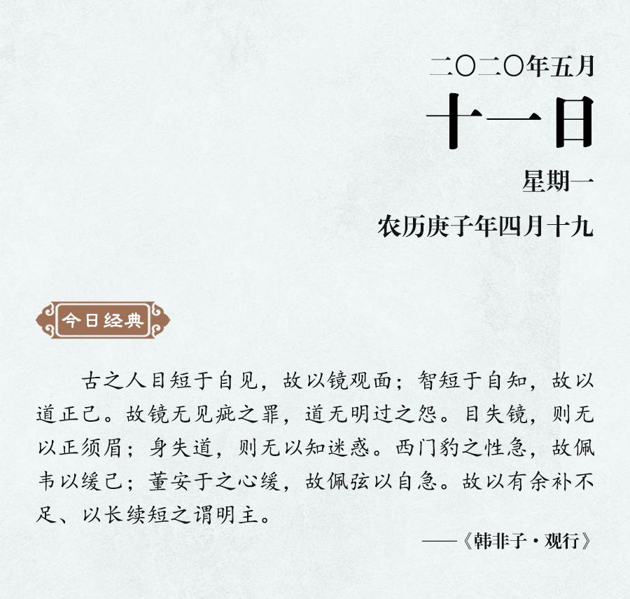 《老子》說:“知人者智,自知者明。”如果不能很好地認(rèn)識到自己的長處和短處,就不能透徹地了解事物。韓非進(jìn)一步說:“目短于自見,故以鏡觀面;智短于自知,故以道正己。”無論是明君還是賢人,都要明確認(rèn)識到自身的不足,如此才能自知自見。“目失鏡則無以正須眉,身失道則無以知迷惑。”這既是說自見的局限,也是說自知的重要。韓非舉例說,魏國的西門豹因為性格急躁,所以佩戴柔軟的皮帶來提醒自己;董安于因為性子很慢,所以佩戴繃緊的弓弦來激勵自己,這兩位都是能夠自知不足的人。