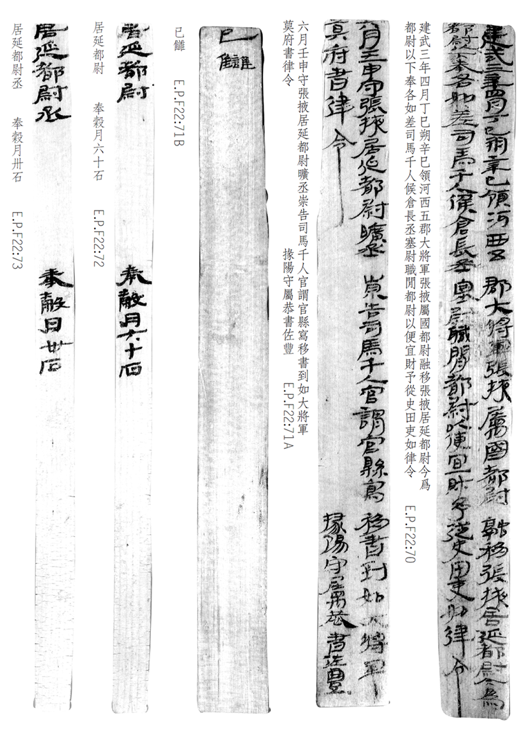 1974年8月出土于甲渠候官遺址第22號房址內(nèi)。簡冊由10枚簡組成,每簡長22.8厘米,前兩簡寬2.5厘米,其余8簡寬1.4厘米。全文200字。內(nèi)容為東漢建武三年(公元25年)竇融統(tǒng)治河西期間留下的一份完整的財政文書。簡文是關(guān)于居延都尉府吏員奉谷標準的通知,由領河西五郡大將軍張掖屬國都尉竇融幕府下發(fā),簡言“如律令”可知其指令具有法律效力。