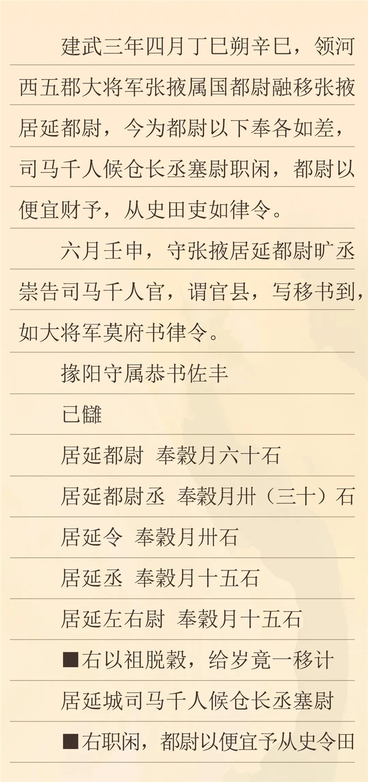這封冊書記載了建武三年,竇融管轄河西時發(fā)布的一條關(guān)于都尉以下官吏奉谷等差的命令。根據(jù)竇融發(fā)布的新規(guī)定,我們可以看到,秩比二千石的居延都尉月奉谷僅為六十石,史書有“十斗一斛”及“十斗一石”的記載,此六十石即是六十斛,相比于史書記載中比二千石每月百斛的俸例要少,而其余官吏的俸祿也相應要少,雖然漢代不同時期的官吏俸祿存在變化,但對比所見的這種情況,可能也跟兩漢之交戰(zhàn)亂頻仍的社會環(huán)境有重要關(guān)系。(李晶整理)