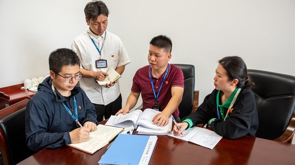圖為唐玉軍(右二)正在與同事們一起研判問題線索。張津 攝