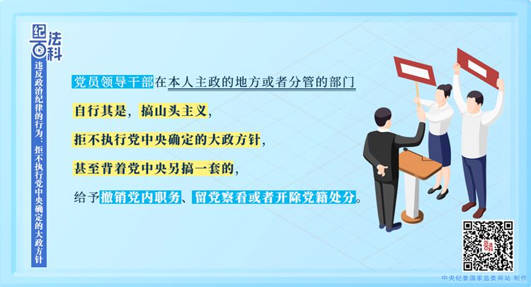 《中國共產黨紀律處分條例》第五十六條第一款規(guī)定,黨員領導干部在本人主政的地方或者分管的部門自行其是,搞山頭主義,拒不執(zhí)行黨中央確定的大政方針,甚至背著黨中央另搞一套的,給予撤銷黨內職務、留黨察看或者開除黨籍處分。