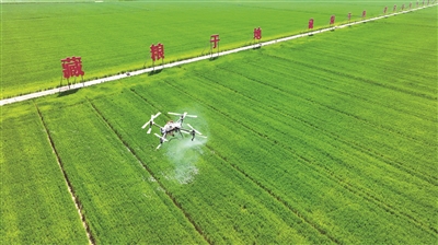 近年來,江蘇省宿遷市宿豫區(qū)多措并舉推動耕地保護(hù)責(zé)任落實(shí),加快現(xiàn)代農(nóng)業(yè)產(chǎn)業(yè)園核心區(qū)建設(shè),保障糧食穩(wěn)產(chǎn)增產(chǎn)。圖為近日,在該區(qū)新莊小麥單產(chǎn)提升示范區(qū),無人機(jī)正在進(jìn)行植保噴灑作業(yè)。朱冠軍 攝