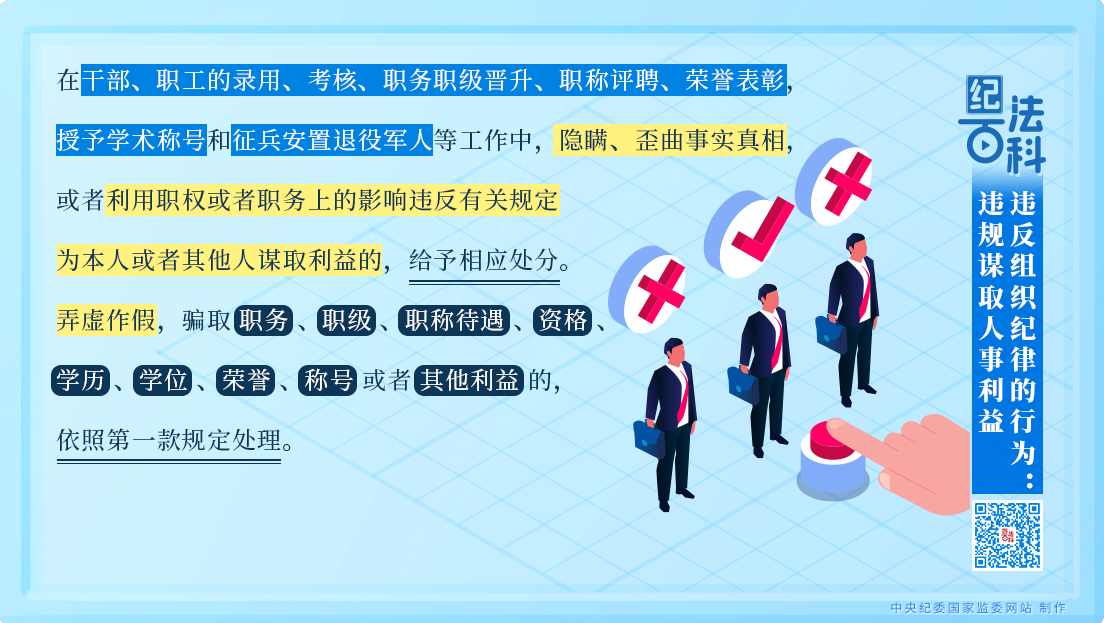 第一款規(guī)定,在干部、職工的錄用、考核、職務(wù)職級晉升、職稱評聘、榮譽(yù)表彰,授予學(xué)術(shù)稱號和征兵安置退役軍人等工作中,隱瞞、歪曲事實真相,或者利用職權(quán)或者職務(wù)上的影響違反有關(guān)規(guī)定為本人或者其他人謀取利益的,給予相應(yīng)處分。