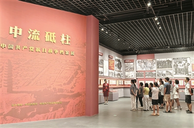 走進(jìn)中國(guó)共產(chǎn)黨歷史展覽館四層專題展廳,首先看到一面紅底金字的大型展板,形似一本翻開(kāi)的書(shū)本。“書(shū)”的正面,“中流砥柱”四個(gè)大字在燈光照射下閃閃發(fā)亮,下方緊跟一行小字“中國(guó)共產(chǎn)黨抗日戰(zhàn)爭(zhēng)檔案展”;側(cè)面,金色字體展示著毛澤東同志《中國(guó)共產(chǎn)黨在民族戰(zhàn)爭(zhēng)中的地位》里的內(nèi)容:“每一個(gè)共產(chǎn)黨員必須發(fā)揮其全部的積極性,英勇堅(jiān)決地走上民族解放戰(zhàn)爭(zhēng)的戰(zhàn)場(chǎng),拿槍口瞄準(zhǔn)日本侵略者。”