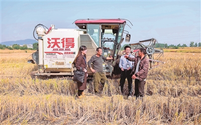 糧食安全是“國之大者”。安徽省含山縣紀委監(jiān)委聚焦高標準農(nóng)田建設(shè)管理中的突出問題開展一線走訪,推動“糧田”變“良田”。圖為該縣紀檢監(jiān)察干部在環(huán)峰鎮(zhèn)城北村水稻收割現(xiàn)場了解相關(guān)情況。歐宗濤 攝