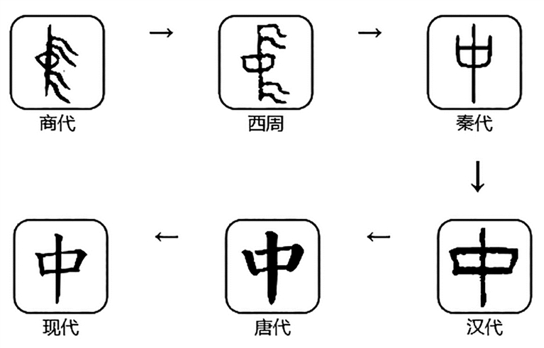 甲骨文“中”象旗幟之形,其上下部都有飄帶。直線的中間加上圈形指示符號(hào),表示中央、中點(diǎn)等一般含義。秦系簡(jiǎn)牘的“中”字省略了象征斿的部分,小篆和隸書字形中間的圈形又變?yōu)榉叫?,成為了現(xiàn)在楷書的“中”。