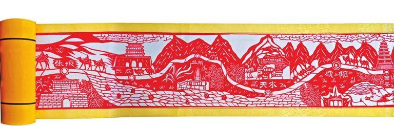 用剪紙藝術再現(xiàn)古絲綢之路的盛景,國家級非遺項目定西剪紙省級代表性傳承人付忠民經(jīng)過長時間的構(gòu)思和調(diào)研,又歷經(jīng)5個月,終于創(chuàng)作出了長達23.38米的剪紙長卷——《古絲綢之路全圖》,再現(xiàn)了絲路古道的文化藝術魅力,該長卷曾一舉創(chuàng)下世界紀錄協(xié)會“世界上最長的剪紙長卷”的世界紀錄。