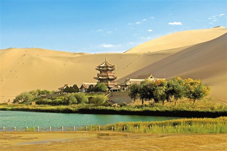 這是10月4日拍攝的甘肅省敦煌市鳴沙山月牙泉景區(qū)。金秋時節(jié),神州大地秋景如畫,盡顯大美中國山河錦繡。 新華社照片