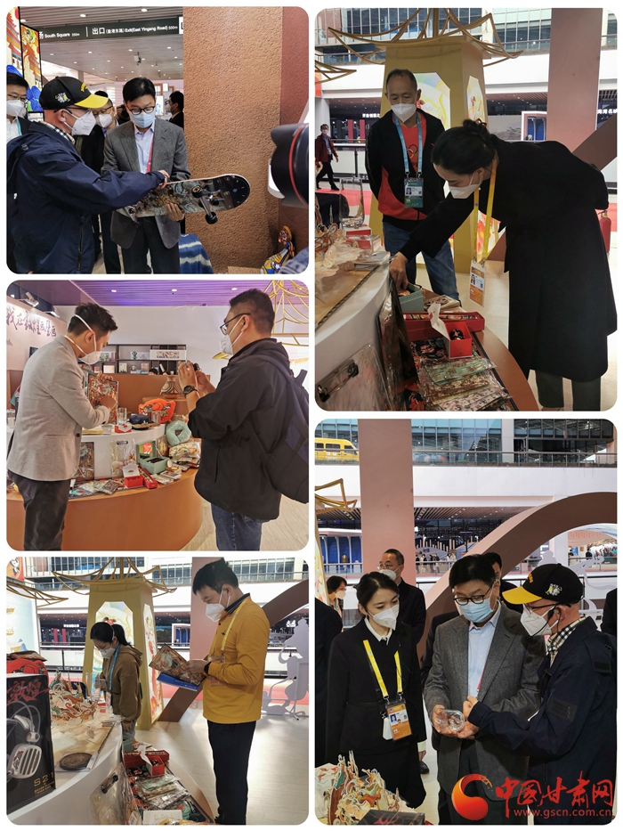 此次在酒泉展臺(tái)上展出的有極樂(lè)系列滑板、雙截棍、九色鹿系列胸針、手提包、伎樂(lè)天系列鑰匙扣、冰箱貼、飛天系列抱枕、書(shū)簽等,新潮的文創(chuàng)產(chǎn)品也拉近了敦煌文化與當(dāng)代人的距離,也吸引了眾多參展商和媒體記者駐足參觀和拍攝報(bào)道。