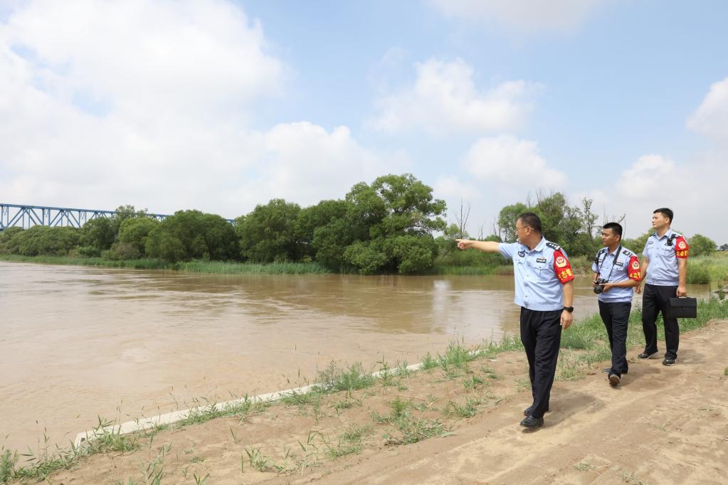 黃河派出所和黃河河務(wù)局水政監(jiān)察大隊(duì)人員對(duì)刁口河生態(tài)補(bǔ)水進(jìn)行巡查。新華社記者 劉詩平 攝