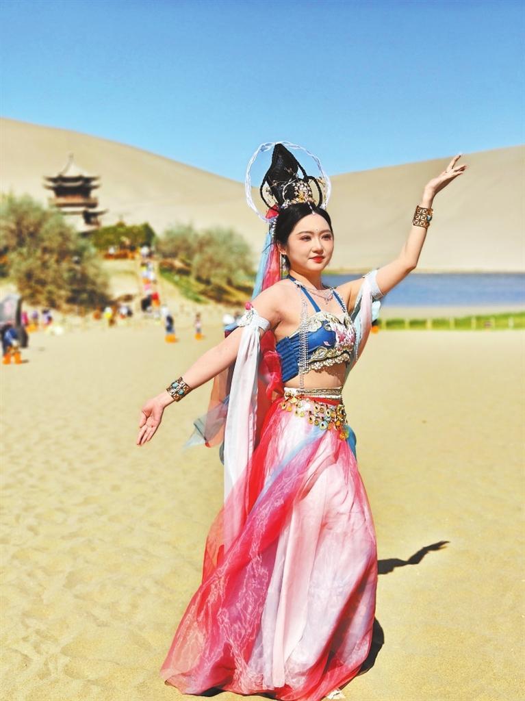 游客在月牙泉景區(qū)身著“飛天”服飾拍照。