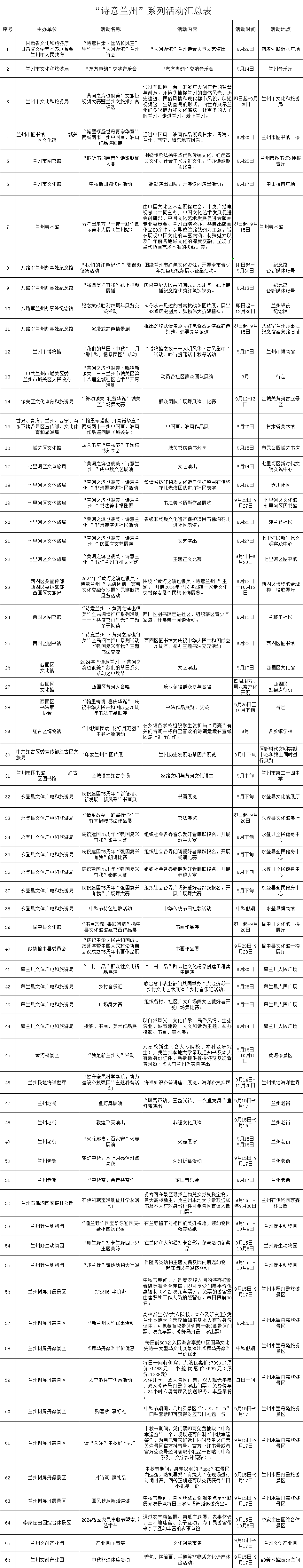 中國甘肅網(wǎng)9月14日訊(西北角·中國甘肅網(wǎng)記者 沈文剛)為預(yù)熱“大河奔流”蘭州詩會(huì)、豐富中秋假期文旅產(chǎn)品供給,蘭州市文旅局即日起至9月30日,推出“黃河之濱也很美·詩意蘭州”系列66項(xiàng)文旅活動(dòng),立足文化賦能旅游體驗(yàn),做優(yōu)產(chǎn)業(yè)、做實(shí)消費(fèi),為市民游客精心打造一場文旅服務(wù)盛宴。