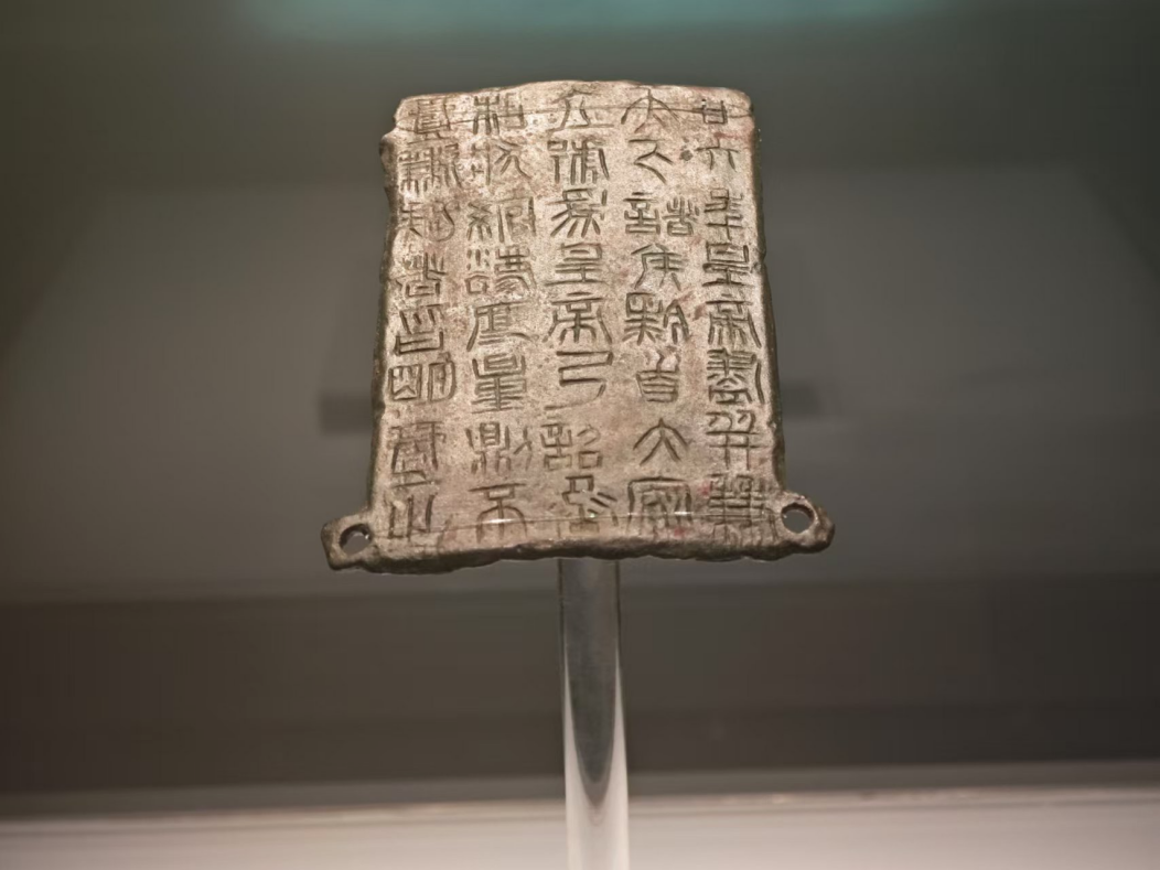 “鎮(zhèn)原縣博物館的鎮(zhèn)館之寶是秦二十六年銅詔版,1976年 4月 1日被鎮(zhèn)原縣城關(guān)鎮(zhèn)富坪村建宅取土的農(nóng)民發(fā)現(xiàn)并上交。在1996年 9月,國家文物局鑒定專家組定為國家一級文物。這塊銅詔版上有文字5 行,共40字,字跡清晰,線條纖細,字體為小篆。在用筆結(jié)構(gòu)上既有秦代小篆規(guī)矩整飭的風范,又保留著大篆文字的某些特點。”鎮(zhèn)遠縣博物館講解員介紹道。