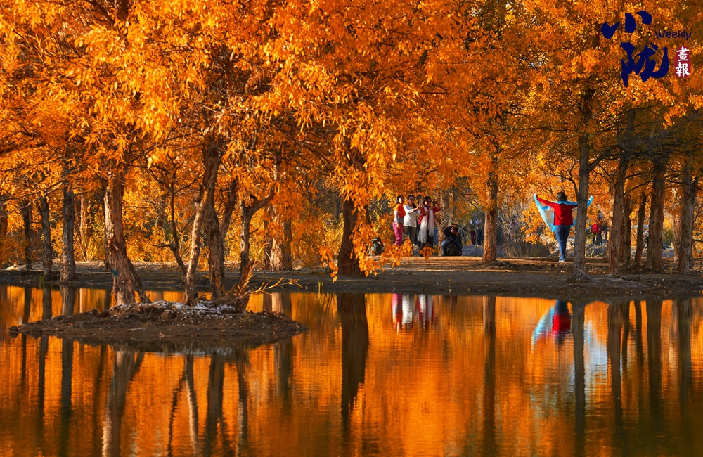 金黃色的胡楊懷抱著湖泊,而湖泊水面倒映著金黃色的胡楊,像一幅色彩斑斕的油畫。