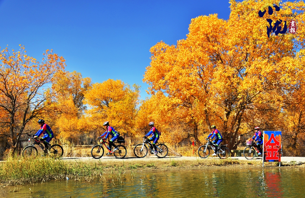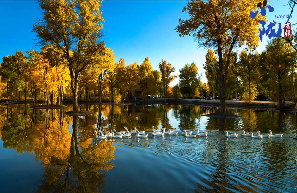 金色的胡楊倒映在蔚藍的水中,白鵝嬉戲,構(gòu)成了一幅幅色彩對比強烈、視覺沖擊力極強的絕美畫面。