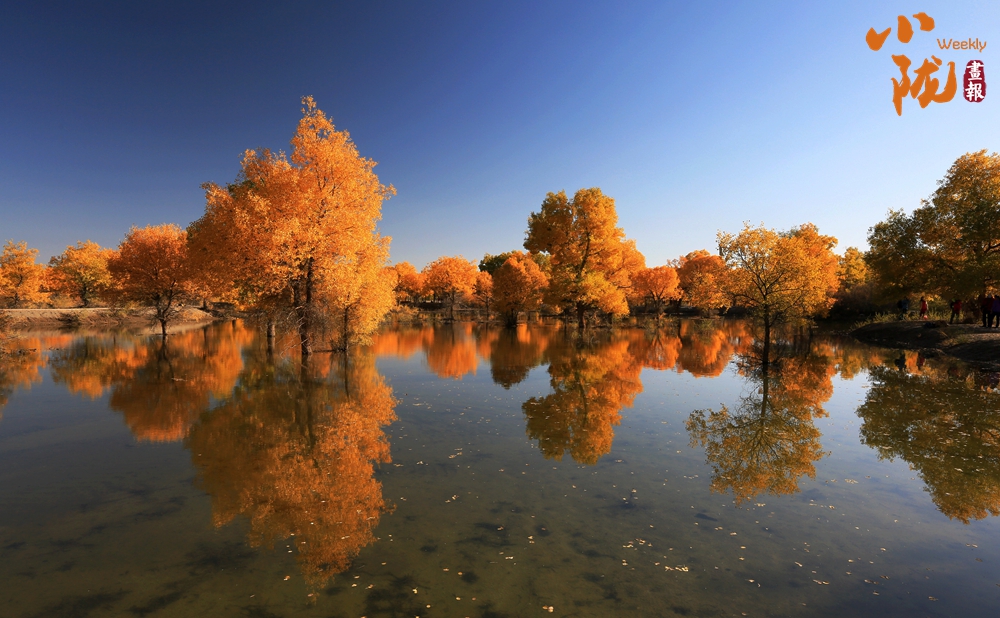 湛藍的天空、清澈的湖水、倒影的胡楊、金色的落葉,斑斕得如同油畫色彩。