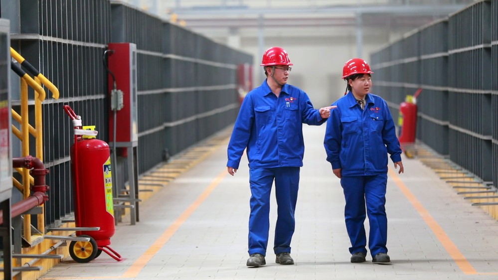 在甘肅稀土公司11000噸萃取生產(chǎn)線,兩名工作人員在巡查這套集數(shù)字化、智能化和綠色化為一體的自動(dòng)化生產(chǎn)線。(本報(bào)記者郭剛 攝)