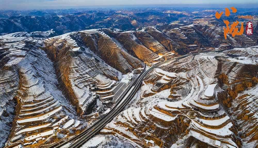 俯瞰雪后華池,溝壑縱橫的黃土高原披上銀裝,陽光斜照雪野之上,投下深淺交錯的光影,靜謐中流轉著溫柔的明暗,純凈而遼遠。