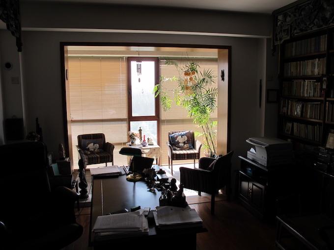 書桌上擺著臺(tái)燈、筆筒,以及他喜歡的各類藝術(shù)品。氣晴好時(shí),逆向照進(jìn)來的陽光會(huì)把這一切都變成“剪影”,很美。