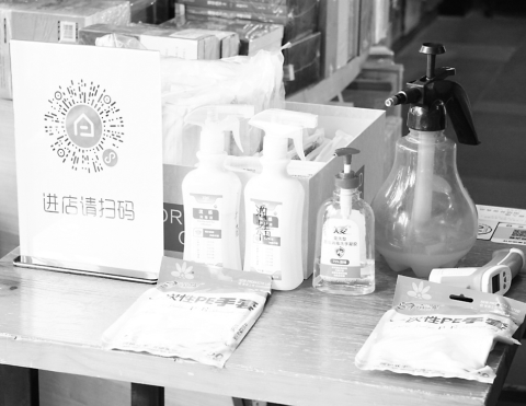 中原圖書大廈服務(wù)臺(tái)為讀者準(zhǔn)備的掃碼處和防疫消毒用品。
