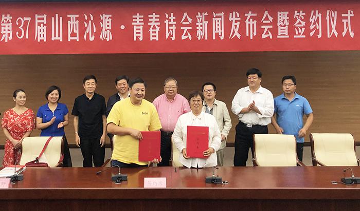 沁源縣委書記金所軍介紹沁源縣盛產(chǎn)油松、褐馬雞,村村有秧歌隊(duì)和籃球場,有山有水,美麗又美好。他將作為“全國森林旅游示范縣”的沁源縣詩意概括為“三晉大地的香格里拉”“近在咫尺的桃花源”。沁源縣委宣傳部部長黃貴河對(duì)沁源縣的文學(xué)創(chuàng)作情況及第37屆“青春詩會(huì)”活動(dòng)承辦設(shè)想進(jìn)行了介紹。發(fā)布會(huì)結(jié)束后,沁源縣政府副縣長李建萍與《詩刊》事業(yè)發(fā)展部副主任藍(lán)野簽定了合作協(xié)議。