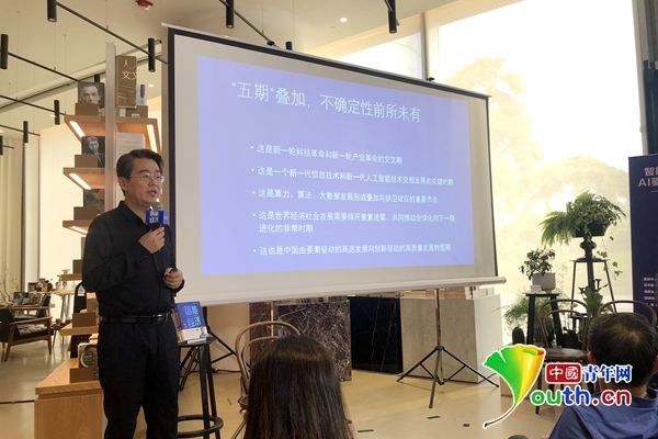《智能經(jīng)濟(jì)》新書研討會(huì)上,張曉峰在進(jìn)行主題演講。中國(guó)青年網(wǎng)記者 張?jiān)姮?nbsp;攝