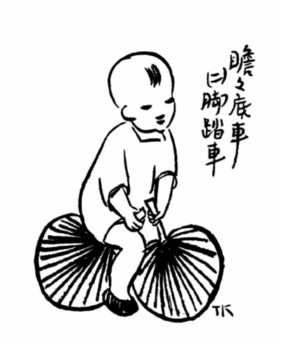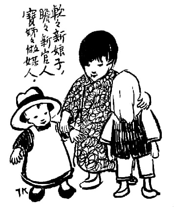 子愷先生藝術之獨特在另一方面——獨樹高標,表現(xiàn)童心童趣,抒情融入詼諧,展示了一種美學境界。此類經(jīng)典之作大多收集于《兒童相》。令人過目不忘者如畫孩子持兩蒲扇,一前一后,作騎馬狀,題曰“瞻瞻的腳踏車”;孩子將自己的鞋子墊于四腳圓凳之下,題曰“阿寶兩只腳,凳子四只腳”。于兒童經(jīng)驗之局限寫其心靈之天真,于不起眼的、平常人視之無所謂的現(xiàn)象中發(fā)現(xiàn)童心之美。還有一幅令人印象深刻,三個孩子,一女稍高,立于中,左側男孩,戴英式禮帽,甚大,右側女孩,頭蒙面布,題曰“軟軟新娘子,瞻瞻新官人,寶姊姊做媒人”。其事極不現(xiàn)實而孩子極慎重,于兒童顯示童心童趣,于畫則表現(xiàn)了先生的愛心和幽默。