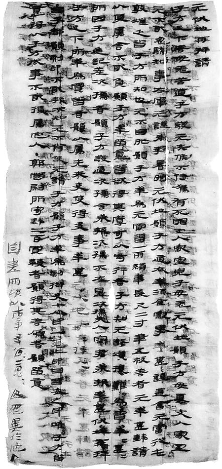 子方足下,善毋恙!苦道子方發(fā),元失候不侍駕,有死罪。丈人、家室、兒子毋恙,元伏地愿子方毋憂。丈人、家室元不敢忽驕,知事在庫,元謹(jǐn)奉教。暑時(shí)元伏地愿子方適衣、幸酒食、察事,幸甚!謹(jǐn)?shù)溃簳?dāng)從屯敦煌,乏沓,子方所知也。元不自外,愿子方幸為元買沓一兩,絹韋,長尺二寸;筆五枚,善者,元幸甚。錢請以便屬舍,不敢負(fù)。愿子方幸留意,沓欲得其厚、可以步行者。子方知元數(shù)煩擾,難為沓。幸甚幸甚!所因子方進(jìn)記差次孺者,愿子方發(fā)過次孺舍,求報(bào)。次孺不在,見次孺夫人容君求報(bào),幸甚,伏地再拜子方足下!所幸為買沓者,愿以屬先來吏,使得及事,幸甚。元伏地再拜再拜!