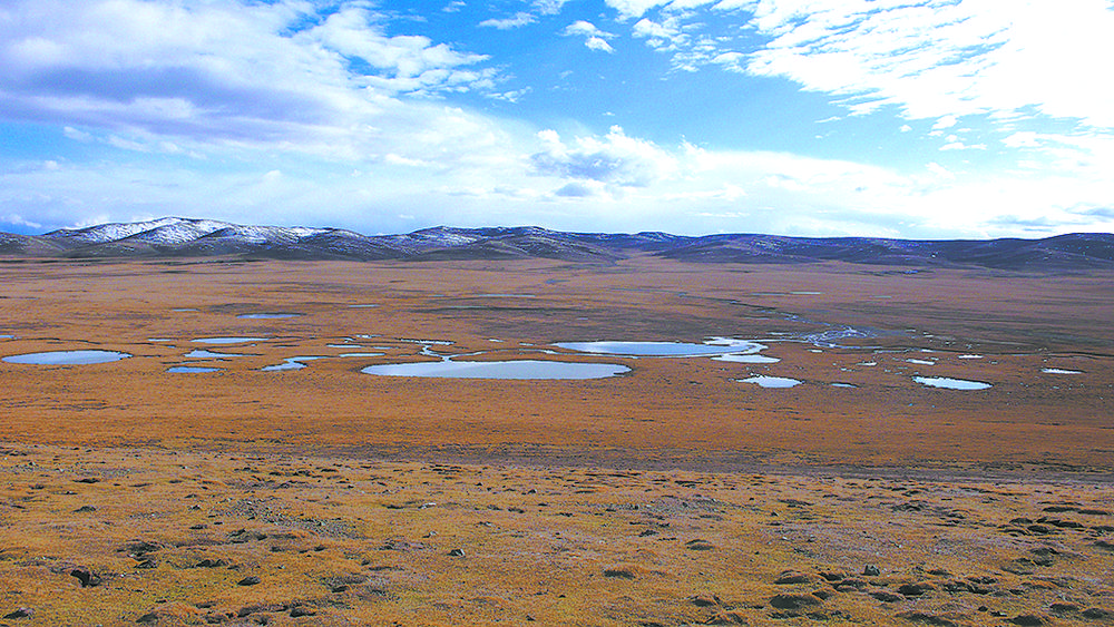 約古宗列位于青藏高原東北部,海拔高度在4200米~4800米,地勢(shì)西北高,東南低。站在腳下小泉邊,抬眼先看到的是西面距我們最近的雅合拉達(dá)合澤山,它是1952 年新中國(guó)第一個(gè)河源查勘隊(duì)曾認(rèn)定的黃河源頭山。南望,遠(yuǎn)處最高的雪峰,是長(zhǎng)江黃河的分水嶺巴顏喀拉山;視線左移,東方藍(lán)天白云下,同樣白雪皚皚的是阿尼瑪卿山。以約古列宗為中心輻射,在這東西長(zhǎng)約220 公里,南北最大寬150 公里的高山草甸帶與高山草原帶的過(guò)渡地帶,東面阿尼瑪卿山阻擋了東南暖濕氣團(tuán)西進(jìn),南面巴顏喀拉山又削弱了溯谷地北進(jìn)的西南季風(fēng)勢(shì)頭,再加之北面布爾漢布山的屏障作用,把源區(qū)與干旱的荒漠地區(qū)隔開(kāi),使這里年平均氣溫在-4℃左右。青藏高原半濕潤(rùn)地區(qū)氣候和遠(yuǎn)處雪山冰川的不斷融化,使母親河上源的兩眼泉和其他那些數(shù)不清的泉,源流不斷,經(jīng)年汩汩。
