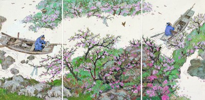 “芳草鮮美,落英繽紛。漁人甚異之,復(fù)前行,欲窮其林。”蔡皋輕聲道,“異”就是驚奇,正因有了好奇,才讓漁人鼓足勇氣,探尋奇境。“我傾注筆墨,來描繪漁人發(fā)現(xiàn)桃花源的整個過程。”