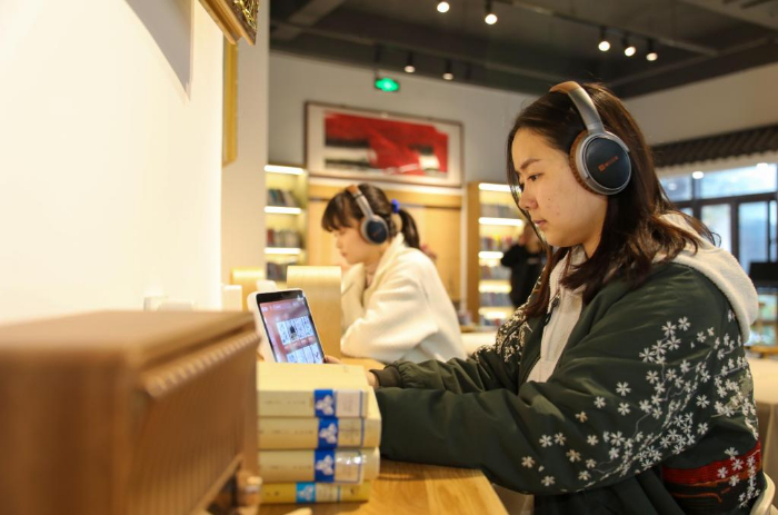 11月20日,市民在馬鞍山市采石磯悅書(shū)房“聽(tīng)書(shū)”。