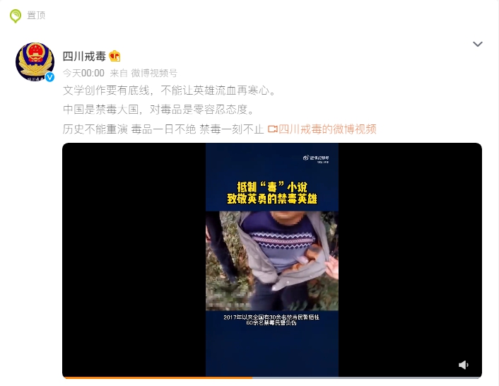 四川省戒毒管理局在此次發(fā)聲中表示,中國是禁毒大國,是世界上列管毒品最多、管制最嚴(yán)的國家,對毒品是零容忍態(tài)度。面對暴戾的毒販,緝毒警察每一次抓捕都以命相搏。聲明強調(diào),抵制“毒”小說,致敬英勇的禁毒英雄。
