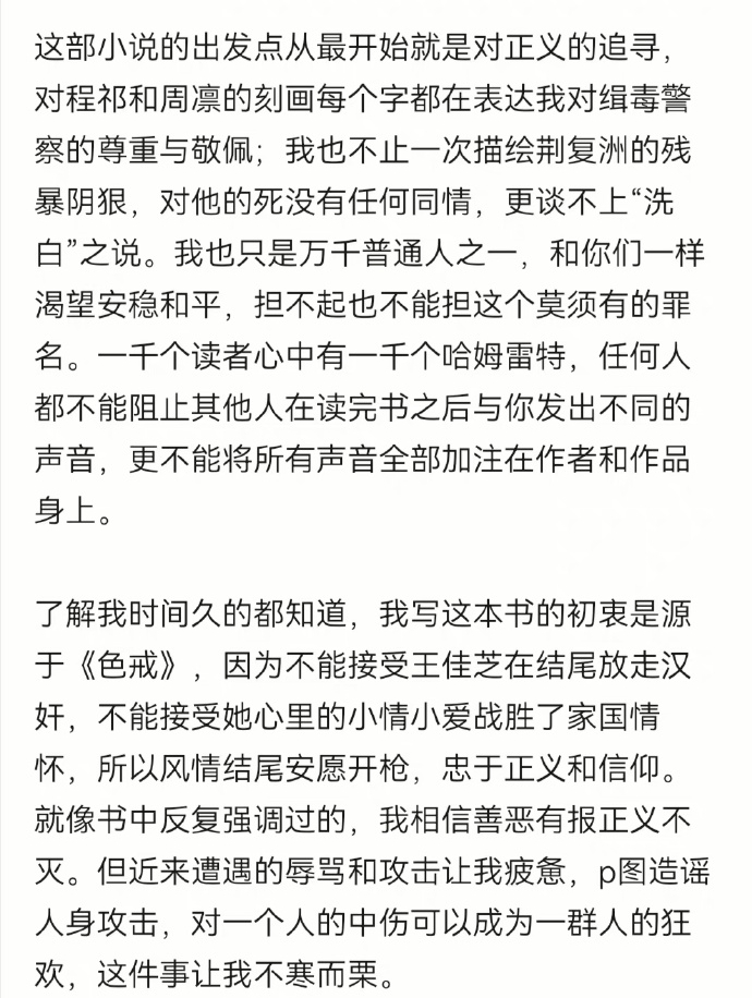 在去年10月14日,疑似《風(fēng)情不搖晃》的作者在其未經(jīng)認(rèn)證的社交媒體賬號上表示,“小說的出發(fā)點是對正義的追尋”。在發(fā)布這條內(nèi)容后,其賬號再未更新,該條微博也關(guān)閉了評論。