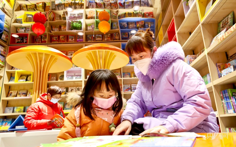 1月23日,一位母親帶著孩子在甘肅張掖錦華書(shū)城讀書(shū)。(央廣網(wǎng)發(fā) 王將 攝)