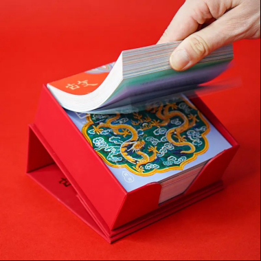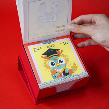 如意取出第一層里紅紅的燙金書刊盒,馬上發(fā)現(xiàn)了它的小機(jī)關(guān):原來盒蓋上有個(gè)吸鐵石,把它翻過來,就可以25度傾斜地放在書桌上,舒服地翻閱一整年的“日子”;每一天的頁面都能被絲滑地撕下,作為小書簽,插在課本讀物中。
