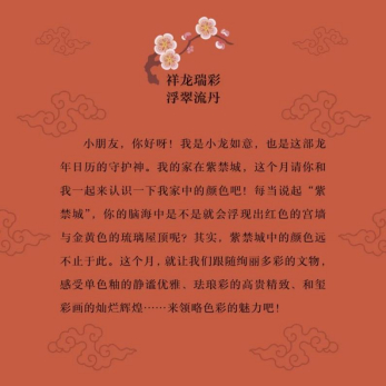 媽媽告訴如意,這是一個(gè)“時(shí)光寶盒”,里面有來自故宮不同領(lǐng)域的10位專家從故宮館藏中精選的262件“龍”文物,它們每天登場(chǎng)介紹自己的故事,還會(huì)請(qǐng)小讀者幫忙,每日動(dòng)手給日歷中的小龍如意卷軸貼出一身漂亮的龍鱗。