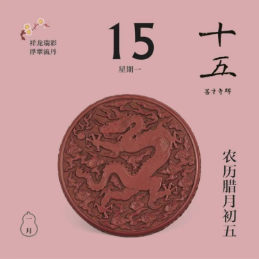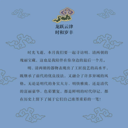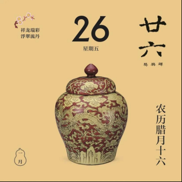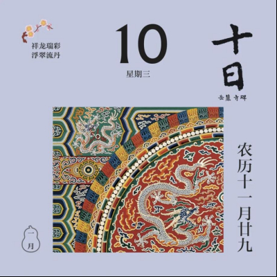 翻開1月月份頁,首先跳入眼簾的,是主題詞“祥龍瑞彩”。這個(gè)月以絢麗的顏色為主線,串起各色龍文物,比如精致的宋代單色釉龍紋盤,絢麗的故宮官式建筑和璽彩畫,還有優(yōu)雅的清代掐絲琺瑯游龍花卉紋瓜式蓋罐……