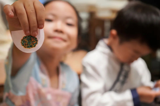 每個(gè)龍文物故事上方,也印有當(dāng)天文物的小圖,它周圍伴有一圈半圓打孔的攏線。如意用小手沿著攏線輕輕一摳,一片小小的“龍鱗”就落在了手心。原來,它就是今天的“成長(zhǎng)值”啊。