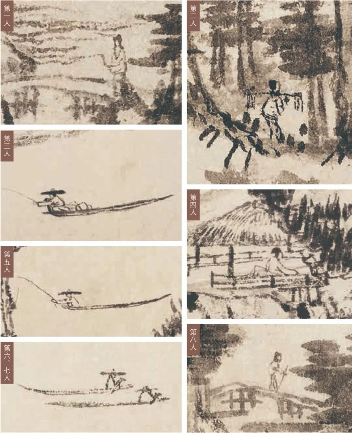說第九位人物之前,我們先來看看上圖展示的已經(jīng)形成共識(shí)的八位人物。從形象上看,這八位人物大概為高士、樵夫和漁父。詳細(xì)解讀這八位人物之前,我們不妨先一起找尋一下隱藏的第九位神秘人物。