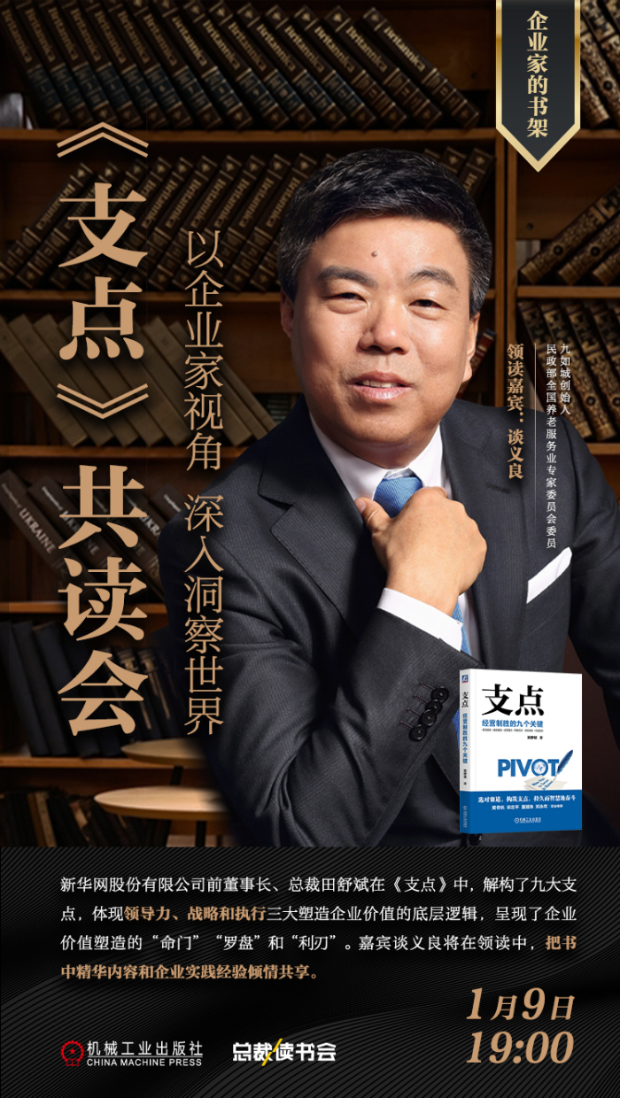 為了企業(yè)家更好地塑造企業(yè)價值,提升格局和眼界,1月9日19:00九如城創(chuàng)始人談義良將領讀《支點》一書,將在“認識管理”視頻號上進行直播。通過如何從多維度視角塑造企業(yè)價值、如何提升企業(yè)家的格局和眼界、如何做好團隊塑造,構(gòu)筑人力資本基石三個方面,從企業(yè)家視角把書中精華內(nèi)容和企業(yè)實踐經(jīng)驗傾情共享,千萬別錯過。