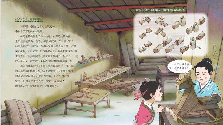 書中提到了在墻面削個角、弄個彎,“拐彎抹角”、方便大家行走的謙讓智慧;齊心協(xié)力,共同出資出力蓋房子的和諧智慧;技術和藝術并存,用榫卯聯(lián)結構件的建構智慧;防患于未然,保證人們生命、生活安全的防患智慧……