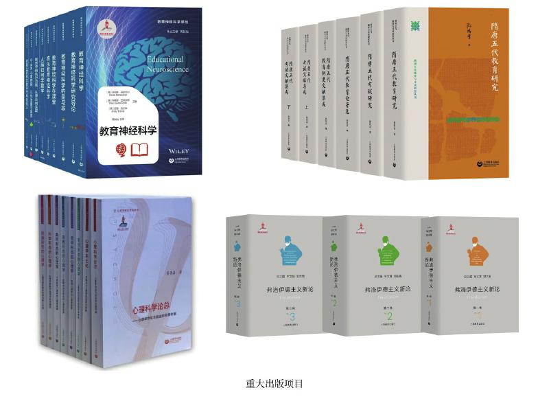 上教社密切關(guān)注新時(shí)代教育發(fā)展的重大理論問(wèn)題與現(xiàn)實(shí)問(wèn)題,響應(yīng)國(guó)家教育發(fā)展戰(zhàn)略需求,精心布局學(xué)術(shù)專(zhuān)業(yè)出版“大項(xiàng)目”,連續(xù)入選國(guó)家重點(diǎn)出版物出版規(guī)劃、2013—2025年國(guó)家辭書(shū)編纂出版規(guī)劃,獲國(guó)家出版基金資助。這其中除前文中的大型專(zhuān)科工具書(shū),還包括一系列教育與心理學(xué)原創(chuàng)研究和前沿研究成果:由中國(guó)教育史學(xué)者孫培青編著的“隋唐五代教育與考試研究叢書(shū)”,構(gòu)建了反映隋唐五代教育與考試全貌的教育理論體系和文獻(xiàn)資料體系,是中國(guó)教育史學(xué)科建設(shè)的一項(xiàng)學(xué)術(shù)文化積累工程;《中國(guó)課程史》以現(xiàn)代課程理論為分析框架,以歷史線索展現(xiàn)中國(guó)學(xué)校課程的新陳代謝;“教育神經(jīng)科學(xué)譯叢”(9冊(cè))是我國(guó)首個(gè)聚焦教育神經(jīng)科學(xué)這一國(guó)際教育研究前沿領(lǐng)域的學(xué)術(shù)譯介系列;《中國(guó)傳統(tǒng)德育心理學(xué)思想新論》系統(tǒng)挖掘整理中華優(yōu)秀傳統(tǒng)文化中蘊(yùn)含的德育心理學(xué)思想,構(gòu)建中國(guó)特色心理學(xué)話(huà)語(yǔ)體系;我國(guó)第一套以大心理學(xué)觀,從本土心理學(xué)視角系統(tǒng)探索和解讀不同形態(tài)心理學(xué)的學(xué)術(shù)系列“心理學(xué)形態(tài)研究系列”(6冊(cè)),全景考察心理學(xué)的命運(yùn)與前途,深入探索中國(guó)本土心理學(xué)的選擇與突破;《弗洛伊德主義新論》(三卷)匯聚國(guó)內(nèi)弗洛伊德主義研究領(lǐng)域的權(quán)威學(xué)者,歷史展現(xiàn)弗洛伊德理論的百年發(fā)展歷程,提供弗洛伊德主義研究的“全景圖”。這些重大出版項(xiàng)目為構(gòu)建中國(guó)特色自主知識(shí)體系,建設(shè)中國(guó)教育學(xué)和心理學(xué)學(xué)科體系、學(xué)術(shù)體系、話(huà)語(yǔ)體系發(fā)揮了重要作用。