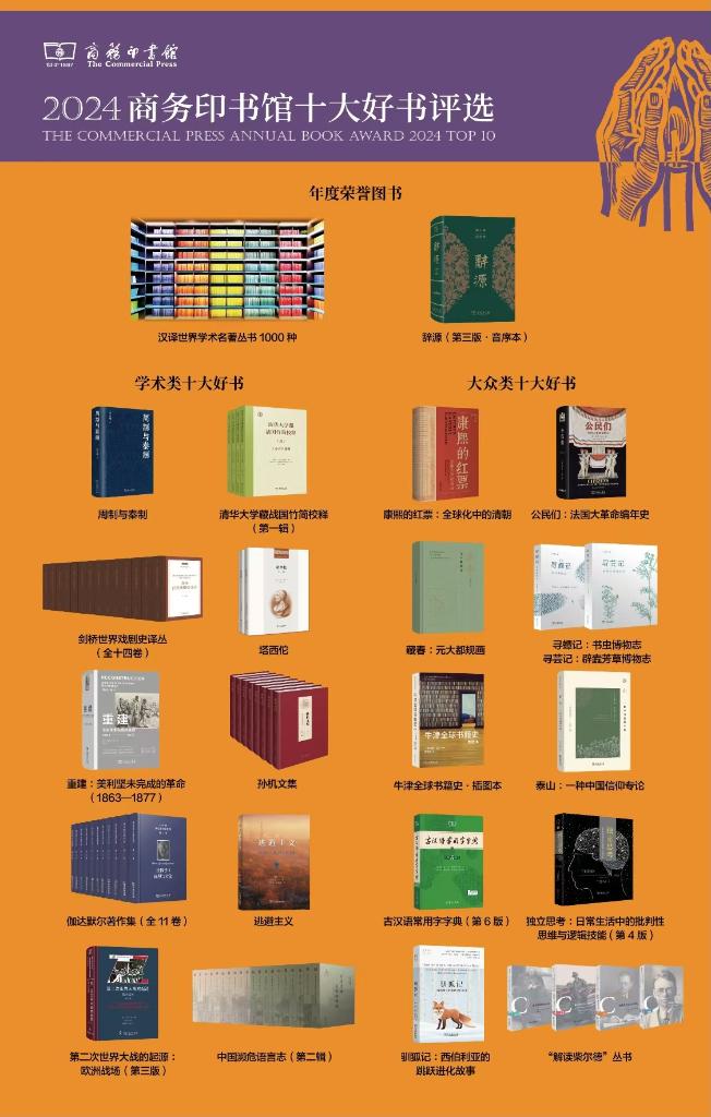 2024商務(wù)印書館十大好書日前在京發(fā)布。“漢譯世界學(xué)術(shù)名著叢書1000種”、《辭源》(第三版·音序本)被評為年度榮譽圖書,《周制與秦制》《清華大學(xué)藏戰(zhàn)國竹簡校釋》(第一輯)等獲評年度學(xué)術(shù)類十大好書,《藏春:元大都規(guī)畫》《古漢語常用字字典》(第6版)等獲評年度大眾類十大好書。