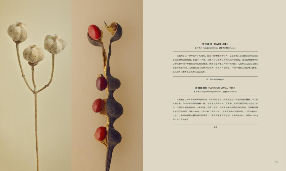 隨后,植物園耗時(shí)6個(gè)月,從3500份標(biāo)本中精心篩選出100種植物果實(shí)與種子。列文·比斯將這些攝影對象放大至80倍,捕捉到植物表面豐富多樣的細(xì)節(jié),照片的精細(xì)程度超乎想象。每張圖片還配有一段簡潔的科普文字,不僅反映了100多年來植物的采集狀況,展示了種子的傳播方式,還介紹了人類對植物材料的利用方法。