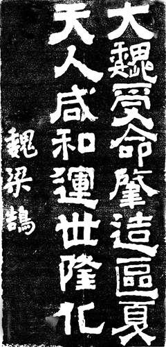 他的書法作品中,具有代表性的是一幅“大魏受命,肇造區(qū)夏,天人咸和,運(yùn)世隆化”的字。這幅字今人能看到拓片。人們?cè)u(píng)價(jià)說:書跡骨氣凝重,筋力豐足,筆勢(shì)雄健,意志戇宕。