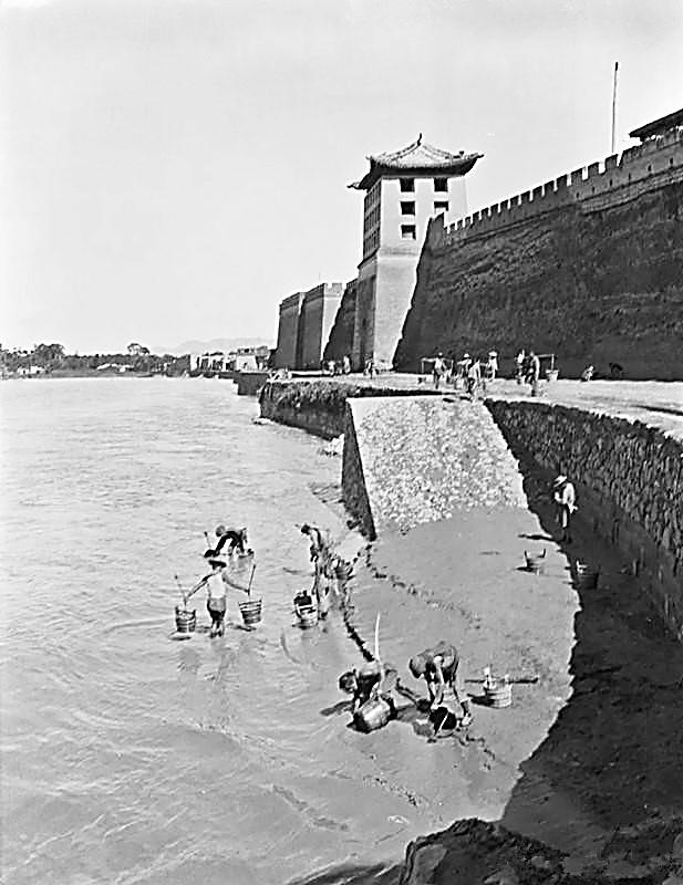 第二張是水客子在黃河中取水的情形??雌饋恚坪跏屈S河大水之后,人們從河中取水。黃河邊的石堤下,堆積的淤泥,還沒有清理。以前,蘭州城墻的位置,就是今天的南濱河路。從淤泥堆積的高度看,這次黃河大水應(yīng)該不小。