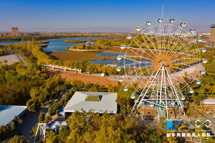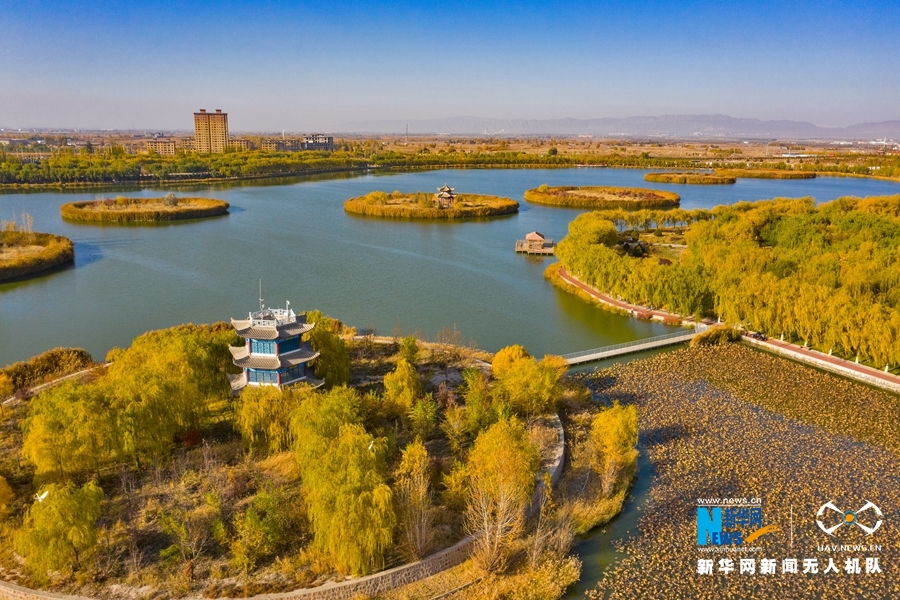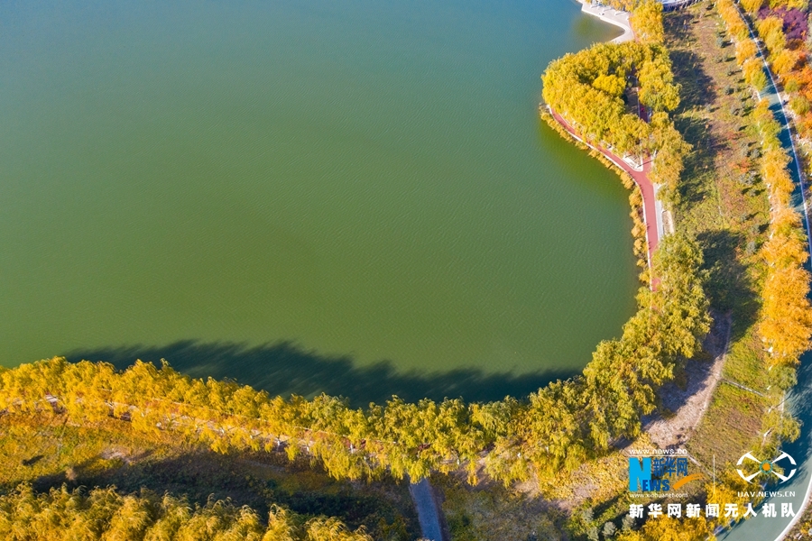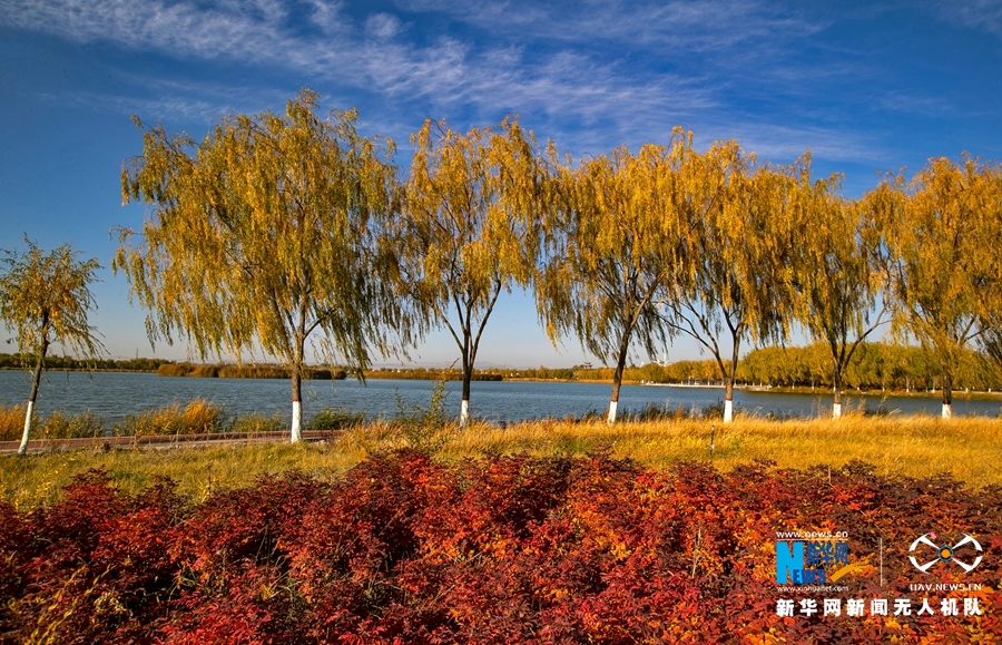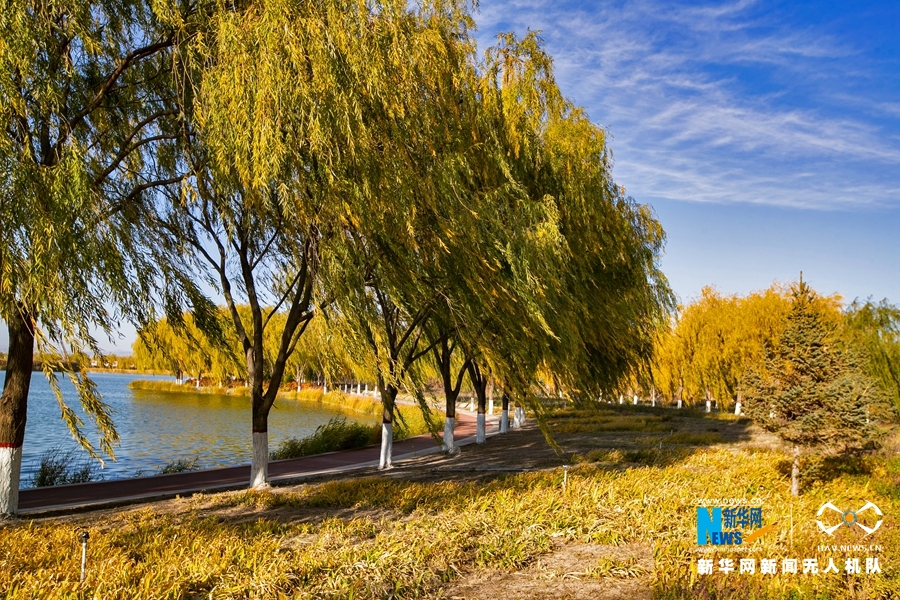 深秋時(shí)節(jié),國(guó)家4A級(jí)景區(qū)甘肅省張掖潤(rùn)泉湖公園秋水依依,草木金黃,呈現(xiàn)出一幅斑斕畫(huà)卷。新華網(wǎng)發(fā)(成林 攝)