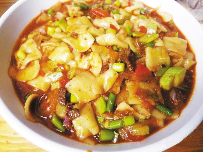 蘭州尕面片的配菜無定式,按照季節(jié)的不同,加入彩椒、番瓜、韭黃、西紅柿等時蔬,怎么香怎么來,讓一碗小小的面片平添幾分田園意蘊。