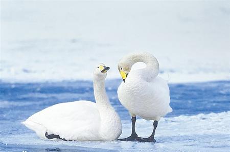 在動物分類學上,這個大家族包括天鵝、雁和鴨,其中一般來說天鵝體型最大,雁次之,鴨最小。天鵝有潔白的羽衣和較大的體型,古人不論從物質層面上還是精神層面上,很早就對它產生了興趣,并賦予它一個專有名字——“鵠”。陳勝那句名言“燕雀安知鴻鵠之志”里有它的身影,歐陽修筆下的“人隨黃鵠飛千里”中也有它的行蹤。帶“鵠”或“天鵝”字眼的詩詞佳句不勝枚舉,但基本都與其飛行既高且遠的寓意有關。根據在天鵝身上安裝的GPS追蹤器和其他鳥類學研究結果顯示,天鵝的遷徙路線并不會飛越喜馬拉雅山,亦無相關目擊記錄,所謂天鵝能飛越珠峰只是一個流傳甚廣的美好謊言罷了。從生物學角度觀察,天鵝是吃素的鳥(雖然人們常常誤會天鵝和大雁是吃魚的,其實它是基本純粹的素食主義者),經常倒立在淺水里取食水生植物的根莖,因而頸部和腹部會被水中的敗葉枯草釋放的色素染黃。