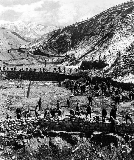 當年莊浪縣鄭河公社上寨村村民大修梯田的場景。